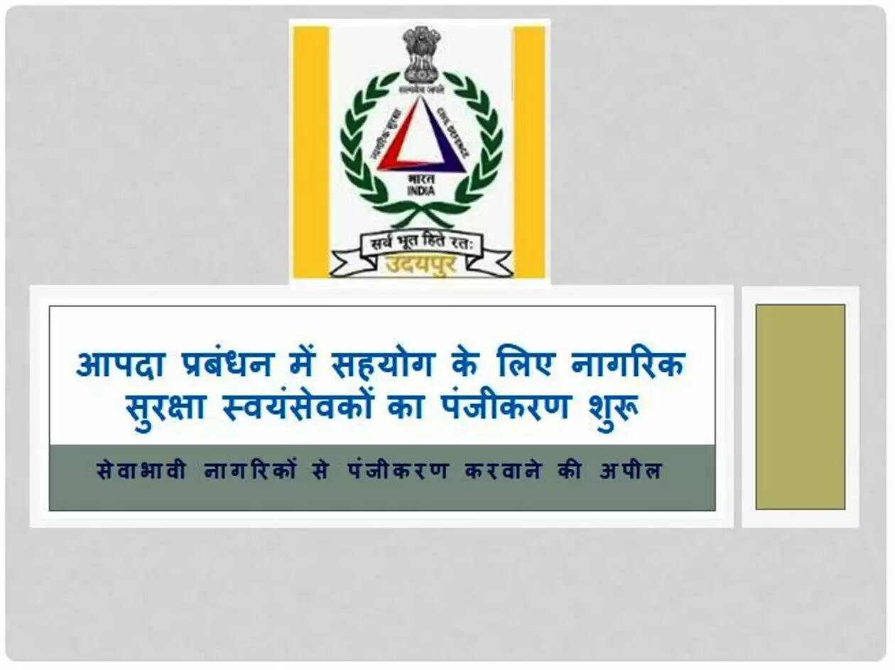 उप नियंत्रक नागरिक सुरक्षा एवं अतिरिक्त ज़िला कलेक्टर प्रशासन दीपेंद्र सिंह राठौड़ ने बताया कि विभाग ने नगर निगम क्षेत्र उदयपुर और सलूंबर (ज़िला सलूंबर) के ऐसे सेवाभावी, स्वैच्छिक एवं अवैतनिक नागरिकों से जुड़ने की अपील की है, जो आपदा के समय पीड़ितों की सहायता के लिए तत्पर रहते हैं।