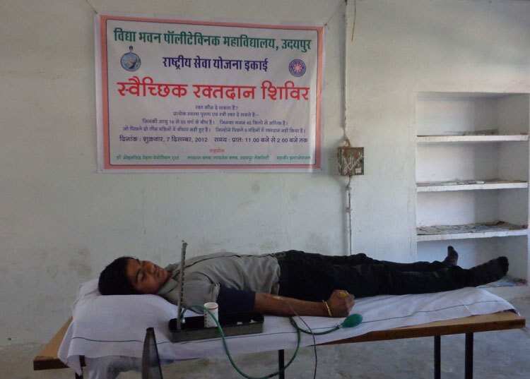Under the banner of N.S.S unit of the Vidhya Bhawan Polytechnic College and with the joint efforts of Dr. Mohan Singh Mehta Memorial Trust, Mahaveer International , Lions Club, Loins Club Lake city and HDFC Bank, the RNT Medical College organized a blood donation camp at the Polytechnic College.