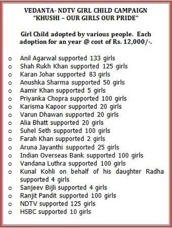 A host of prominent personalities including Shah Rukh Khan, Aamir Khan, Karan Johar, Kajol, Aruna Jayanthi, CEO, Capgemini India, Kiran Mazumdar Shaw, Chairman & Managing Director of Biocon Limited, Vinita Bali, CEO, Britannia, Anu Aga, MP, RajyaSabha& Former Chairperson, Thermax, Suhel Seth, Karisma Kapoor, Anushka Sharma, Shaan, SaniaMirza, Shahnaz Husain, Alia Bhat, Varun Dhawan, Ayushman Khurrana, Kunal Kohli, Vandana Luthra and more, joined NDTV Group CEO Vikram Chandra and Priyanka Chopra, who took centre-stage to appeal to millions of viewers to generate maximum funds for this worthy cause. Later Mr. Anil Agarwal, Chairman of Vedanta Group too joined and encouraged his own employees to come forward and adopt girl child and secure their future. His company has been looking after 200,000 underprivileged girls with focus towards their health, education and nutrition.