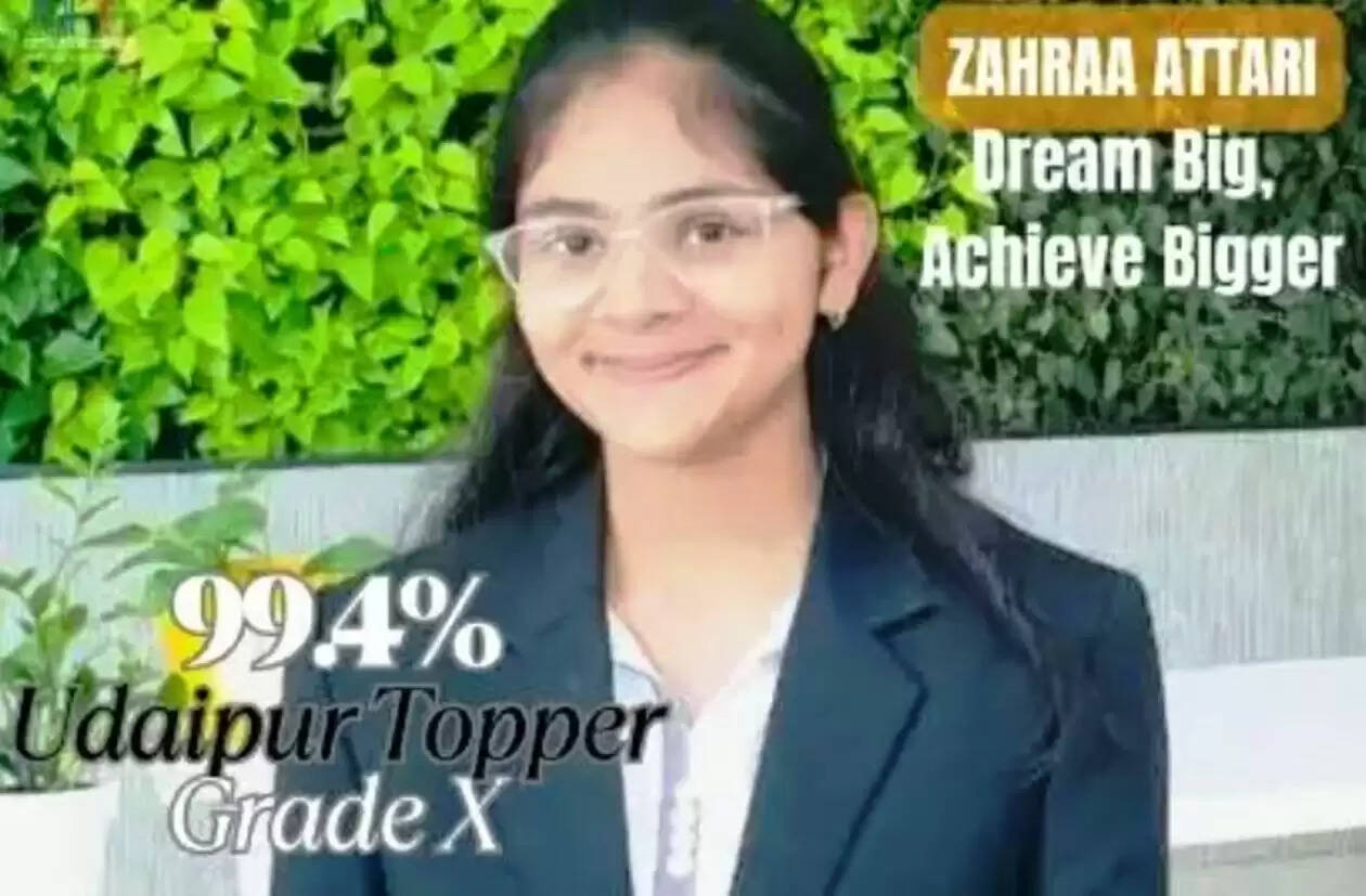 उदयपुर में कई छात्रों ने बेहतरीन परिणाम हासिल किए हैं, लेकिन एक नाम जो असाधारण उपलब्धि के लिए सबसे अलग है, वह है उदयपुर के दिल्ली पब्लिक स्कूल की छात्रा ज़ाहरा अत्तारी का। सीबीएसई ग्रेड 10 बोर्ड परीक्षाओं में 99.4% अंकों के साथ, ज़ाहरा ने न केवल शहर में टॉप किया है, बल्कि पूरे राजस्थान में दूसरी सबसे ऊंची रैंकिंग भी हासिल की है।