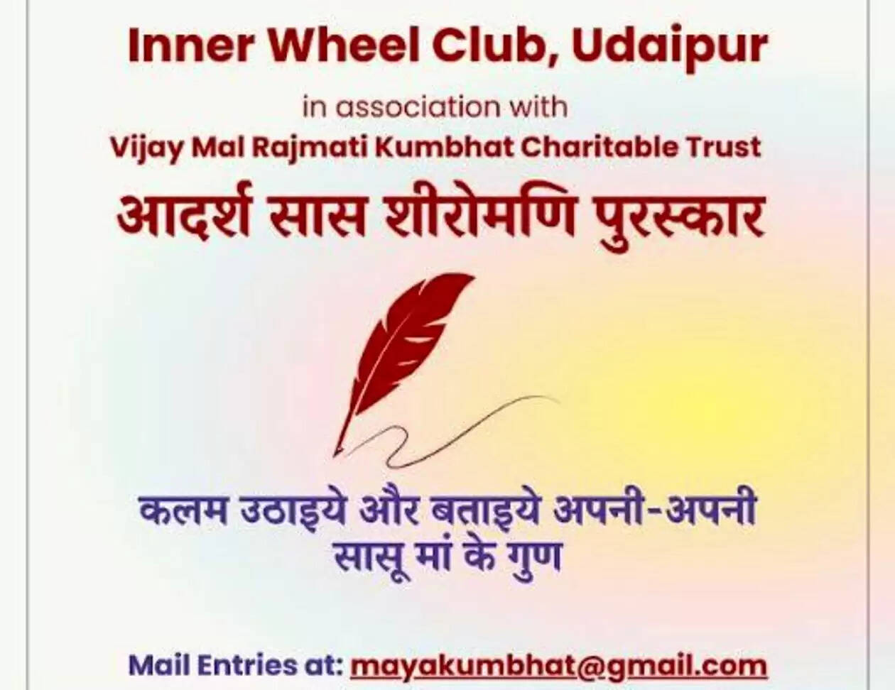इन्हीं भावनाओं को सम्मान देने और समाज में आपसी रिश्तों में मिठास और सामंजस्य का संदेश फैलाने के उद्देश्य से इनरव्हील क्लब उदयपुर की ओर से इनरव्हील राजमती आदर्श सास पुरस्कार का आयोजन करती रही है। इसमें संस्था की ओर से पारिवारिक डोर की मजबूती के मानकों पर खरा उतरने वालीं सास-बहुओं का सम्मान किया जाता है। इस बार इस कार्यक्रम का सातवां सोपान है। इसके लिए आवेदन की प्रक्रिया शुरू हो गई है। आवेदन 15 अप्रैल तक मांगे गए हैं।