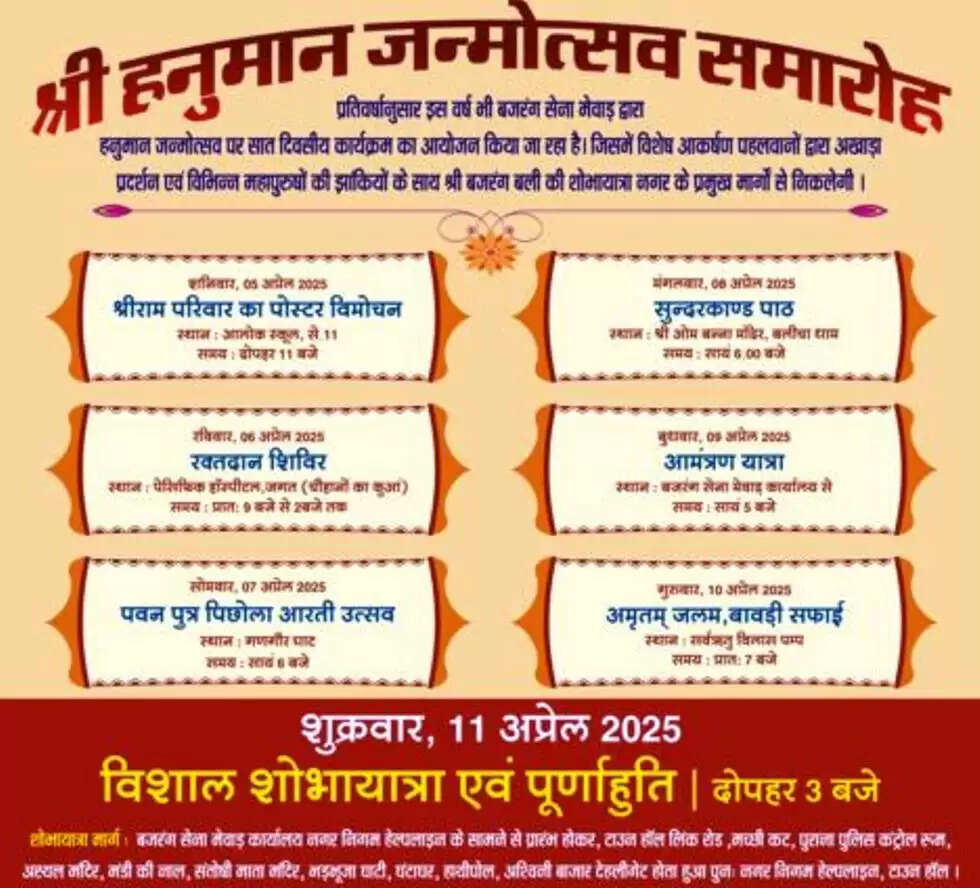 प्रमुख कमलेंद्र सिंह पंवार ने बताया कि हर वर्ष की भांति इस वर्ष भी बजरंग सेना मेवाड़ द्वारा हनुमान जन्मोत्सव की पूर्व संध्या 11 अप्रैल, शुक्रवार को बजरंग सेना मेवाड़ कार्यालय नगर निगम हेल्पलाइन शक्ति नगर से दोपहर 3 बजे यात्रा प्रारंभ होगी, जो की विभिन्न मार्गो से होती हुई पुनः बजरंग सेना मेवाड़ कार्यालय पहुंचेगी।