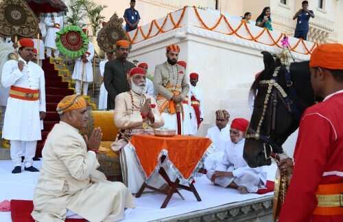 पारंपरिक पहनावे में श्री मेवाड़ के पारिवारिक सदस्य एवं मेवाड़ के पूर्व राजघरानों के मेहमान उपस्थित थे। जीवंत विरासत संरक्षण के क्षेत्र में कार्यरत अरविन्द सिंह मेवाड़ के पुरोहित, कर्मांत्री और ज्योतिषियों ने नख-शिख आभूषणों, कांठी, सुनहरे छोगों, मुखभूषण, लगाम आदि से सज्जित अश्वों को माणक चौक तक लाने का आह्वान किया। ठुमकते हुए अश्व पूजन स्थल पर पहुंचे।