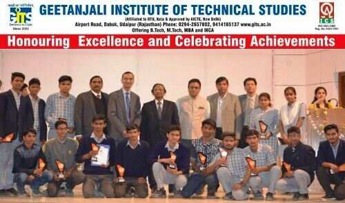 गीतांजली इंस्टीट्युट ऑफ टेक्नीकल स्टेडीज उदयपुर के तत्वाधान में बुधवार कों आर सी ए सभागार भवन उदयपुर मे मेघावी छात्र सम्मान समारोंह आयोजित किया गया। इस समारोह मे जिलें भर सें 22 प्रमुख विद्यालयो के 200 प्रतिभावान विद्यार्थियों को अवार्ड व प्रमाण पत्र सें सम्मानित किया गया। कार्यक्रम का आयोजन प्रोफेसर मोहित माथुर एवं प्रोफेसर सौरभ पोरवाल ने किया। कार्यक्रम का आयोजन सांस्कृतिक, शैक्षणिक एवं खेलकुद में प्रतिभावान छात्र छात्राओ कों प्रोत्सहित करने हेतु गिट्स उदयपुर द्वारा आयोजित किया गया। समारोह के प्रारम्भ में गिट्स के डायरेक्टर डॉक्टर प्रोफेसर के एन सेठ ने स्वागत उदबोधन में कहा कि गीतांजली ग्रुप के कई प्रतिष्ठान है। उसमे से मुख्य खनिज, ग्रेनाइट के साथ कई और विभागों मे गीतांजली का नाम प्रख्यात है। उन्होने बताया कि आज के युग मे साइंस के बिना जीवन अकल्पनीय है, आज दुनिया मे साइ्रंस ने हर काम को सरल बनाने का काम किया है। साथ ही उन्होने बताया कि 12वीं के कक्षा के पश्चात् साइसं विषय के छात्रो के लिए गींताजली नें मेडिकल, इन्जीनियरीगं व मेनेजमेंट से सम्बधिंत शिक्षा संस्थानों कों प्राथमिकता दी है । प्रोफेसर के एन सेठ ने बताया कि इस कार्यक्रम के आयोजन का मुख्य उद्देश्य उन प्रतिभावान छात्र छात्राओ को प्रोत्साहित करना है जों विभिन्न क्षेत्रों मे उत्कृष्ट है।