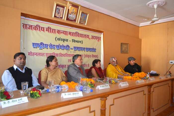 "संकृत ज्ञान-विज्ञान का मूल कारण उसका वैदिक साहित्य हैं" यह विचार वेद संगोष्ठी के समापन अवसर पर सुखाडिया विश्वविध्यालय के कुलपति प्रो.त्रिवेदी ने व्यक्त किए। इस अवसर पर विधि, हर्षिता, भारती, कृष्णा, मोनिका ने सरस्वती वंदना प्रस्तुत की।