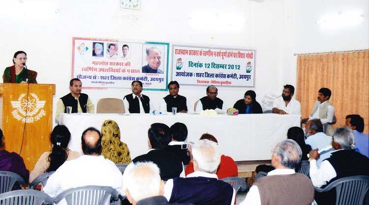 राजस्थान की गहलोत सरकार की स्वर्णिम उपलब्धियों के चार वर्ष पूर्ण होने पर शहर जिला कांग्रेस कमेटी की ओर से अशोक नगर स्थित विज्ञान समिति भवन में प्रात: 10.30 बजे बैठक आयोजित की गई। इस अवसर पर शहर जिला कांग्रेस कमेटी की अध्यक्ष नीलिमा सुखाडिय़ा ने प्रदेश कांग्रेस कमेटी के सचिव एवं उदयपुर प्रभारी आर.आर. तिवाड़ी का मेवाड़ी पगड़ी एवं शॉल पहनाकर स्वागत किया।