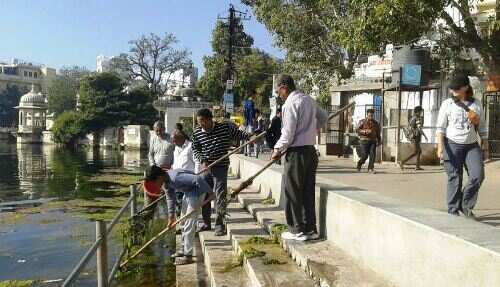 पिछोला के अमरकुंड एवं हनुमान घाट पर झील मित्र संस्थान ,झील संरक्षण समिति एवं डॉ मोहन सिंह मेहता मेमोरियल ट्रस्ट के सयुंक्त तत्वाधान में श्रमदान कर झील क्षेत्र से घरेलू सामग्री व कपड़े,कोल्ड ड्रिंक, पानी व शराब की बोतले, मालाये, नारियल, पॉलीथिन व भारी मात्रा में जलीय खरपतवार निकाली।