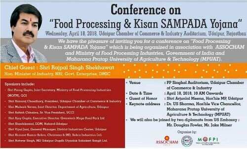 एसोचेम एवं उदयपुर चैम्बर आॅफ काॅमर्स एण्ड इण्डस्ट्री द्वारा और महाराणा प्रताप यूनिवर्सिटी आॅफ एग्रीकल्चर एण्ड टेक्नोलाॅजी के सहयोग से "फूड प्रोसेसिंग एवं किसान सम्पदा योजना" पर बुधवार, दिनांक 18 अप्रैल 2018 को एक दिवसीय काॅन्फ्रेन्स का आयोजन किया जा रहा है। एसोचेम के डायरेक्टर डाॅ. ओम एस. त्यागी ने बताया की एक दिवसीय काॅन्फ्रेन्स का शुभारम्भ उदयपुर चैम्बर आॅफ काॅमर्स एण्ड इण्डस्ट्री के पी.पी. सिंघल आॅडिटोरियम में 18 अप्रैल 2018 को प्रातः 10 बजे से होगा।