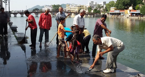संवाद पूर्व पिछोला के चांदपोल घाट पर झील मित्र संस्थान, झील संरक्षण समिति व डॉ मोहन सिंह मेहता मेमोरियल ट्रस्ट द्वारा आयोजित श्रमदान द्वारा झील से घरेलू अनुपयोगी सामान, शराब की बोतले, पुराने कपडे, पोलथिन, प्लास्टिक व जलीय घास निकाली।