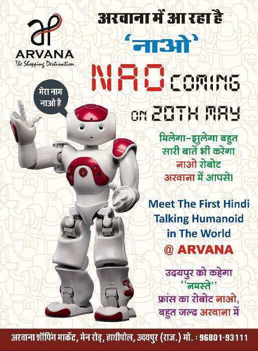 नाओ (NAO) दुनिया का एक मात्र ऐसा मानव सदृश (Humanoid) है, जो आपसे हिंदी में बात करेगा ! हाथीपोल स्थित अरवाना – द शौपिंग डेस्टिनेशन में नाओ अपनी काबलियत को आम जनता के समक्ष पेश करेगा.