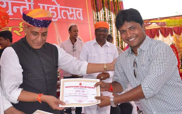 उदयपुर के युवा पत्रकार महका जगत के संपादक राजस्थान पत्रकार परिषद्, उदयपुर के अध्यक्ष जयप्रकाश माली को पत्रकारिता के क्षेत्र में उल्लेखनीय कार्यों के लिए महाराणा प्रताप जयंती पर बांसवाडा में आयोजित संभाग स्तरीय समारोह में भाजपा के राष्ट्रीय अध्यक्ष राजनाथ सिंह ने सम्मानित कियाl