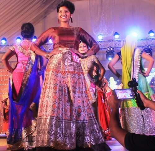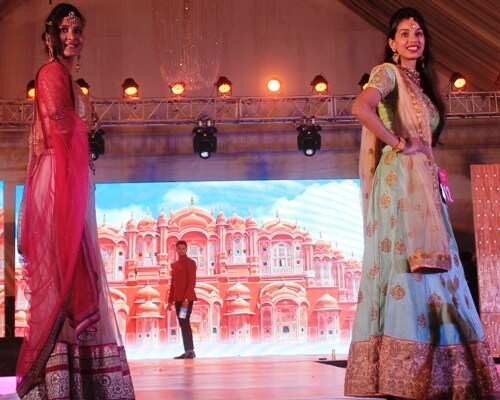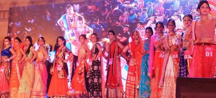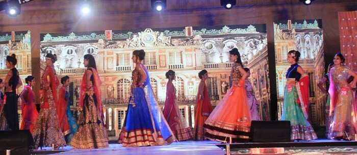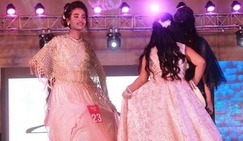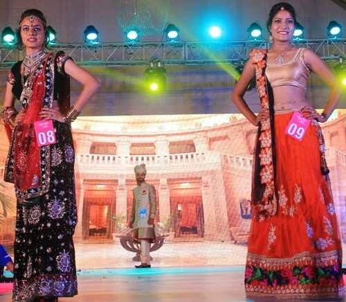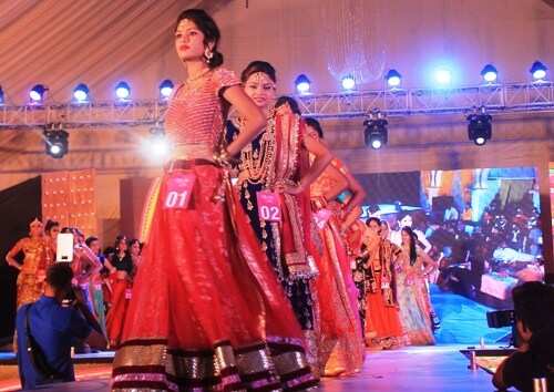मिस फैशन शो की प्रतिभागी युवतियां लहंगा-चोली में