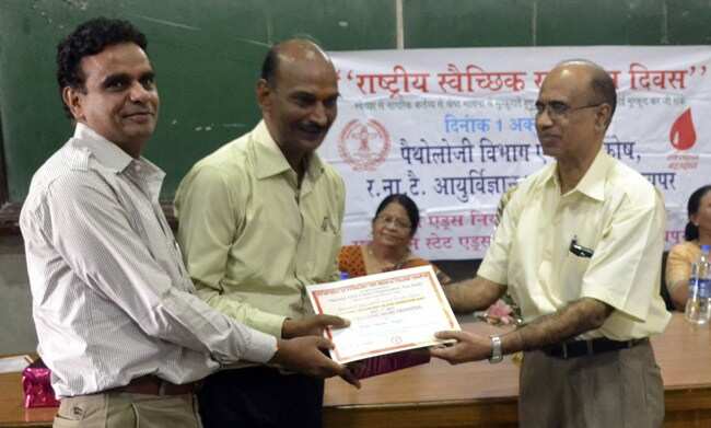राष्ट्रीय स्वैच्छिक रक्तदान दिवस के उपलक्ष्य में आरएनटी आयुर्विज्ञान महाविद्यालय के प्रधानाचार्य एंव नियन्त्रक डॉ. एस. के. कोशिक एवं डॉ चन्द्रा माथुर, अति प्रधानाचार्य एवं प्राध्यापक एंव विभागाध्यक्ष पैथोलोजी विभाग एवं डॉ. संजय प्रकाश सह प्राध्यापक, ट्रांसफ्युजन मेडिसन विभाग के निर्देशन में विभिन्न कार्यक्रमों का आयोजन रखा गया।