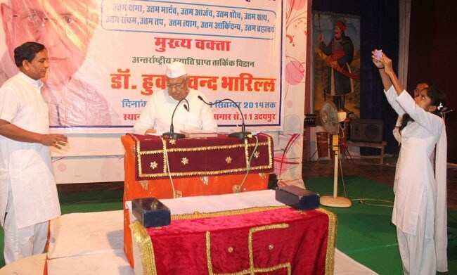 अखिल भारतीय जैन युवा फैडरेशन के तत्वावधान में चल रहे दश लक्षण महापर्व प्रवचन श्रृंखला के अन्तर्गत त्याग धर्म पर से. 11 स्थित आलोक स्कूल सभागार में अन्तर्राष्ट्रीय ख्याति प्राप्त तार्किक विद्धान डाॅ. हुकमचन्द भारिल्ल ने कहा कि “त्याग वस्तु को अनुपयोगी अहितकर जानकर किया जाता है जबकि दान उपयोगी व हित वस्तुओं का दिया जाताि है।”