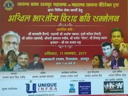 ट्रस्ट चेयरमेन अशोक जैन ने बताया कि उपरोक्त जनसेवार्थ कार्य हेतु धन संग्रह के लिये लायन्स क्लब महाराणा द्वारा आगामी 11 नवम्बर को शिल्पग्राम के मुक्ताकाशी रंगमंच पर अखिल भारतीय विराट कवि सम्मेलन आयोजित किया जाएगा। जिसमें पद्मश्री अशोक चक्रधर, बाल कवि बैरागी, नवोदित वीर रस की कवियित्री कविता तिवारी, अनिल अग्रवंशी, मुमताज़ नसीम, राजेश चेतन, हिमांशु बवंडर और राव अजातशत्रु जैसे राष्ट्रीय कवि श्रोताओं को गुदगुदाने के साथ-साथ वर्तमान राजनीतिक परिप्रेक्ष्य पर व्यंगात्मक कविताएं प्रस्तुत करेंगे।