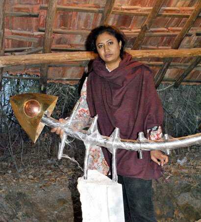 कार्यशाला में अहमदाबाद की देविबा ने प्रस्तर खण्ड व विभिन्न धातुओं के सम्मिश्रण से कृति तैयार की जिसमें धातु निर्मित तीर एक अनूठके अंदाज में सृजित किया है।