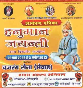 बजरंग सेना मेवाड़ की ओर से हनुमान जयंति के अवसर पर सात दिवसीय जनजागरूकता समारोह का आगाज शनिवार को सुबह 09 बजे सेक्टर 11 स्थित श्रीराम मंदिर में श्रीराम परिवार पोस्टर विमोचन एवं महाआरती से किया जायेगा।