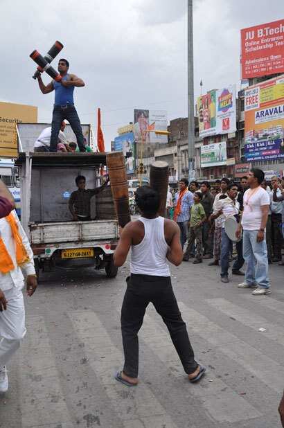 शहर से गुजरते हुए दल के कार्यकर्ताओ ने अखाड़ा प्रदर्शन किया, वही शोभायात्रा में राम लक्ष्मण की झाँकियो ने सबका ध्यान आकर्षित किया।