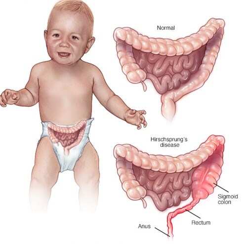 हर्षस्प्रंग डिसीज़ नामक बिमारी में जन्म से ही आंतों का कुछ या ज्यादा हिस्सा खराब होता है और इस वजह से मल सही जगह से बहार निकल नहीं पाता है जिसके कारण पेट फूलता जाता है और बच्चे की जान भी जा सकती है। इस बिमारी का पता इस बच्चे की गंभीर स्थिति के कारण केवल सर्जरी द्वारा ही लगाया जा सकता था