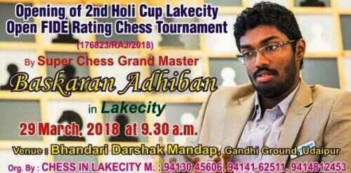 लेकसिटी के इतिहास में पहली बार सुपर गे्रंडमास्टर बी अधिबन अपने खेल का परिचय देंगे। अध्यक्ष राजीव भारद्वाज ने बताया कि चेस इन लेकसिटी की मेजबानी में होने वाली 29 मार्च से शुरू होनी द्वितीय होली कप फीड़े रेटिंग शतरंज प्रतियोगिता का उद्घाटन सुपर ग्रेंडमास्टर बी अधिबन करेगें।
