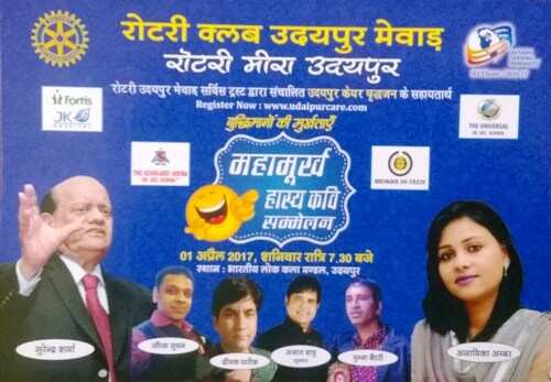 वरिष्ठ नागरिकों को 24 घंटे हर प्रकार की सुविधाएं उपलब्ध कराने के लिए जिला प्रशासन द्वारा लागू किये गये उदयपुर केयर नामक प्रोजेक्ट को अपने हाथ में लेकर रोटरी क्लब मेवाड़ द्वारा उसका सफलतापूर्वक संचालन हेतु धनसंग्रह के लिए 1 अप्रेल को रोटरी क्लब मींरा के साथ शहर में लोककला मण्डल में शाम साढ़े सात बजे से पहली बार महामूर्ख हास्य कवि सम्मेलन का आयोजन किया जा रहा है। यह कवि सम्मेलन हास्य से सराबोर रहेगा। क्लब अध्यक्ष संदीप सिंघटवाडिय़ा ने बताया कि इस कवि सम्मेलन में देश के हास्य सम्राट एवं चार लाईना फेम कवि पदमश्री सुरेन्द्र शर्मा,कवि सौरभ सुमन, कवियित्री डॉ.अनामिका अम्बर, कवि मुन्ना बैटरी, कवि दीपक पारीक एवं कवि अजातशत्रु अपनी हास्य रचनाओं से सभी को हास्य से सराबोर करेंगे। कवि सम्मेलन के सूत्रधार कवि अजातशत्रु होंगें।