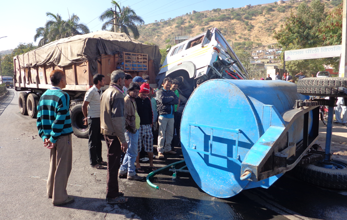 जानकारी के अनुसार टैंकर चालक बिछीवाडा मीठी नीम निवासी रघुनाथ पुत्र किशन राजपूत सुबह 11 बजे पटेल सर्कल के डिवार्इडर पर लगे पौधों को पानी पिलाने आया था तभी अचानक पीछे से आते हुए एक ट्रोले ने टैंकर को टक्कर मार दी जिससे ट्रोले का केबिन पुरी तरह श्रतिग्रस्थ हो गया तथा टैंकर सड़क पर पलट गया जिससे लम्बे समय तक यतायात अवरुद्ध हो गया। टेकंर चालक द्धारा सुरजपोल पुलिस को सुचना देने पर ट्रोला चालक के खिलाफ मामला दर्ज कर दिया गया है। ट्रोला शिव मोर्टस कम्पनी का है ओर इसमे कोयला भरा हुआ था। घटना के बाद दोनो वाहनो को भारी मशकक्त के बाद हटाया गया ।