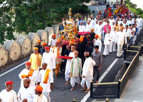 सिटी पैलेस स्थित मंदिर श्री बाणनाथजी से ठाकुरजी ज्ञानरायजी, पीताम्बर राय जी एवं बाणनाथ जी की परंपरानुसार विशाल शोभायात्रा निकली। सिटी पैलेस ऑर्गेनाइजेशन के बैण्ड बाजों की मधुर धुनों के साथ ठाकुरजी की रामरेवाड़ी के आगे सुरक्षा प्रहरियों की टुकडिय़ां मार्च पास्ट करते हुए चल रही थी। शोभायात्रा में पैलेस ऑर्गेनाइजेशन के आकर्षक ढंग से सजे-धजे अश्व मय घुड़सवार के साथ चल रहे थे। इसके बाद चांदी की रामरेवाड़ी में सवार ज्ञानरायजी को पैलेस के श्रद्धालु चंवर ढुलाते हुए चल रहे थे।