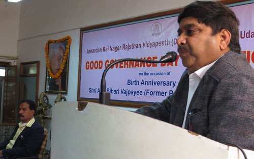 समारोह की अध्यक्षता करते हुए कुलपति प्रो. एस.एस. सारंगदेवोत ने कहा कि सुशासन के लिए सिद्वांत, आदर्श एवं नियमों में मधुर समंजस्य होना जरूरी हैं। बिना उच्च आदर्श के सुशासन की एक कोरी कल्पना है। इसके लिए पारदर्शिता एक आवश्यक शर्त है। सुशासन की श्ुारूआम व्यक्ति को अपने घर से करनी चाहिए।ऐसी अनेक छोटी छोटी जिम्मेदारी है जिसका निर्वाह अपने को करना है।