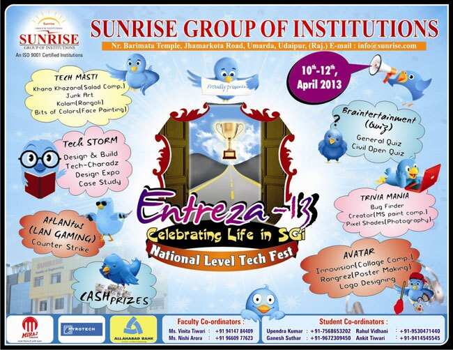 उमरडा स्थित सनराईज ग्रुप ऑफ इंस्टीट्युशन के फैकल्टी ऑफ इंजीनियरिंग में प्रतिवर्श होने वाले तीन दिवसीय टेक फेस्ट एंट्रेज़ा 2013 का आयोजन 10 अप्रैल से 12 अप्रैल तक होगा।