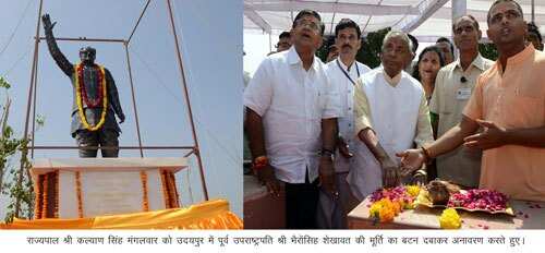 श्री सिंह मंगलवार को उदयपुर में पूर्व उपराष्ट्रपति श्री भैरोंसिह शेखावत की प्रतिमा के अनावरण के पश्चात नगर निगम द्वारा आयोजित भव्य समारोह में बतौर मुख्य अतिथि संबोधित कर रहे थे। उन्होंने इससे पूर्व रानी रोड स्थित बोलार्ड पार्क में नवस्थापित श्री शेखावत की 9 फीट ऊंची एवं 726 किग्रा वजनी एवं 8.95 लाख लागत की कांस्य प्रतिमा का बटन दबाकर लोकार्पण किया।