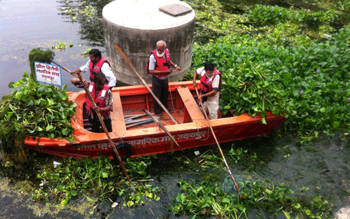 The members of Jheel Hiteshi Nagrik Manch had a hard time cleaning the lakes today at Chauhano ki Gali as the lake’s surface was brimming with hydrilla and ceratophyllum grass that made rowing the boat difficult. The boats had to be pulled to the side with the help of a tight rope.