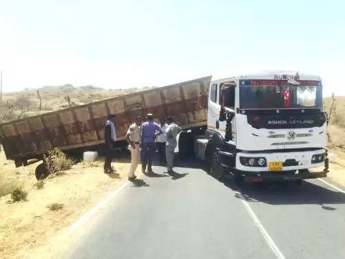 सलुम्बर ज़िले के लसाड़िया उपखंड क्षेत्र के कूण पुलिस थाना क्षेत्र में एक सफेद पत्थरों से भरा ट्रैलर पुलिया पर लटक गया।