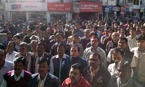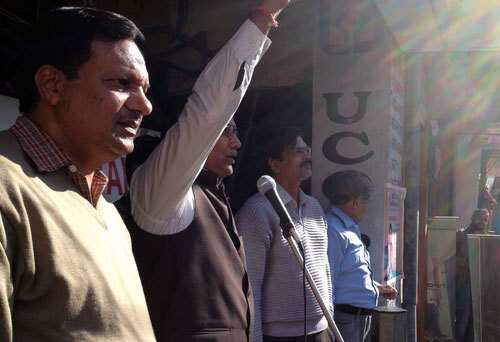 The bank officials collected on the street of Bank Tiraha in protest of the delayed 10th wage settlement. Under the banner of Indian Bank and UFBU (United Forum of Banks Udaipur) they held this nationwide protest in Udaipur.