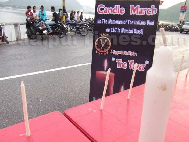 To pay tributes to and condolences to the families of the people who died in the recent Mumbai serial blasts on 13th July, a candle march was organized by the youth social group – Yuvaz, at Lake Fateh Sagar this evening. The procession was also attended by singer Shahnawaz Khan (X-Factor fame).