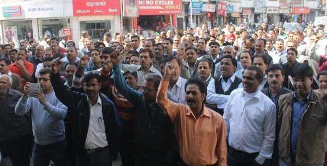 A large number of bank employees under the leadership of D.K Jain, P.S Khichi, O.P Mutha, G.L Joshi, B.L Agarwal and Raman Sood first gathered outside HDFC Bank, Durga Nursery Road and started demonstrating against government.