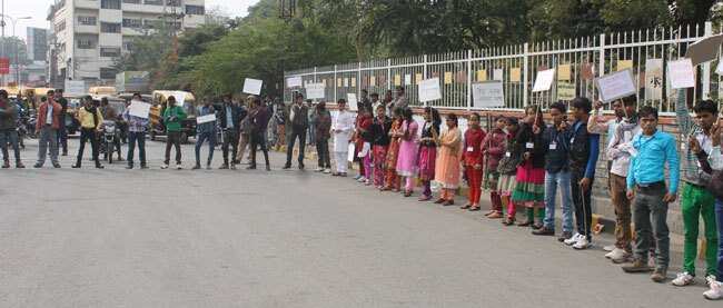 Around 250 individuals including Students from 30 districts and Faculty of Bharat Sanskrit Parishad carried the rally from Town Hall to Surajpol, Bapu Bazar and Delhigate; finally assembling back at Town Hall.