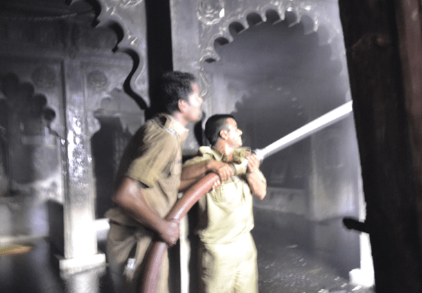 The first floor of Baghore Ki Haveli has been gutted due to devastating fire which broke out today afternoon due to alleged short circuit. However, no major damage has been reported in the decade old heritage building which has turned into a museum and headquarter of West Zone Cultural Centre. However, tons of wooden scraps obliterated in flames.