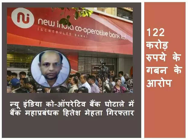 मुंबई की न्यू इंडिया को-ऑपरेटिव बैंक (New India Co-Operative Bank) घोटाला मामले में बैंक के महाप्रबंधक हितेश मेहता को गिरफ्तार किया गया है। मुंबई की आर्थिक अपराध शाखा (EOW) ने 122 करोड़ रुपये के गबन के आरोप में हितेश मेहता को गिरफ्तार किया है।