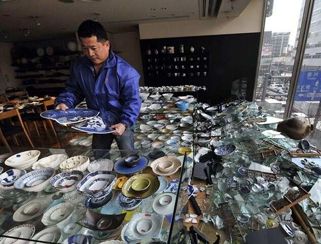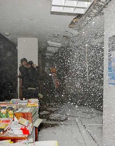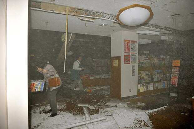 People try to take cover in a Sendai bookshop as an earthquake hits