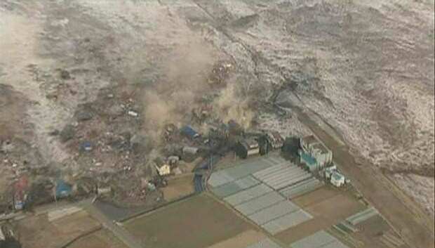 A tsunami floods an area in Iwaki, Fukushima prefecture