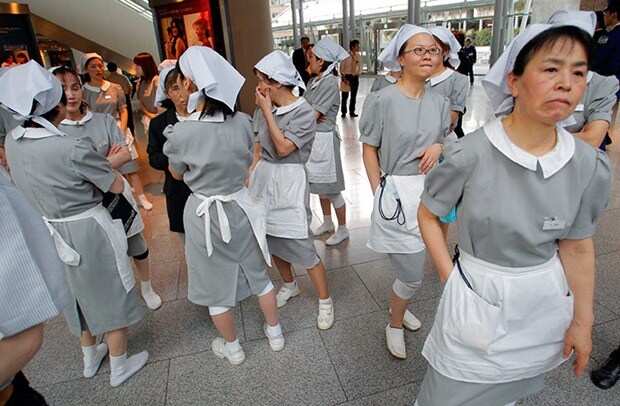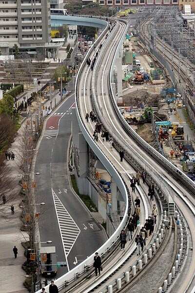 Passengers on Tokyo’s Yurikamome transit line walk along an elevated track towards Shiodome station