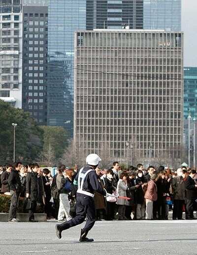 A policeman runs across a street as people stand outdoors after being evacuated from buildings in Tokyo’s financial district