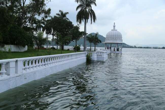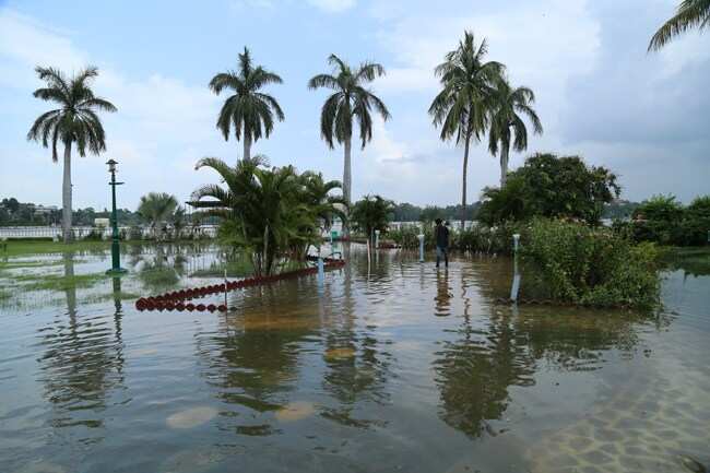 The serene Nehru Park situated on an island in the middle of Lake Fatehsagar is flooded with lake water as the level of Fatehsagar rose after heavy rainfall.