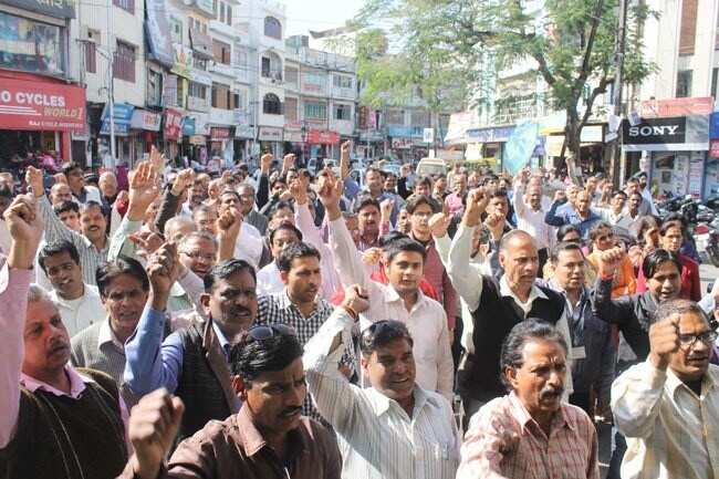 The United Forum of Bank Union has declared 2-days nationwide strike, regarding which bank employees of Udaipur demonstrated today at Bank Tiraha. The demands include implementation of Human Resource and Khandelwal Committee, which has been pending from past many years.