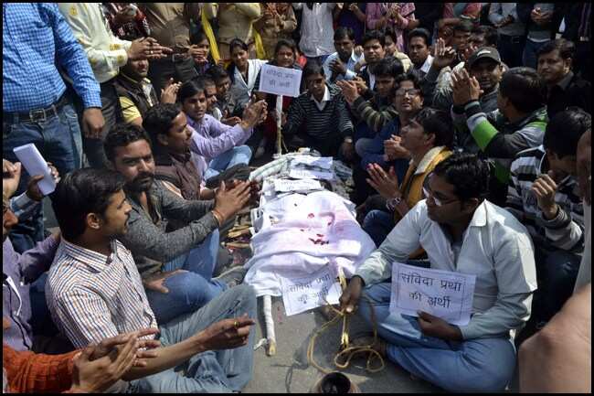 Contractual nursing conducting the last rites of Samvida Pratha (contract system). Context: Indefinite strike of contractual nursing employees demanding permanent appointments
