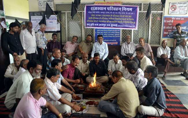 Protesting Government’s decision of nearly privatizing Rajasthan Roadways, the employee union conducted Sadh Budhhi Yagya at the City bus stand in Udiapol.