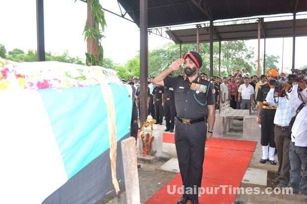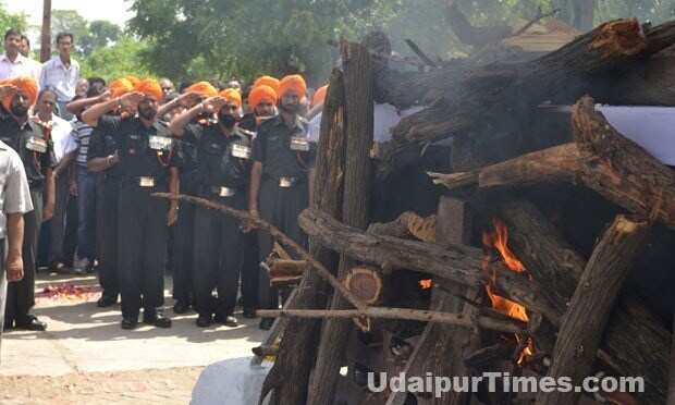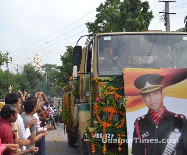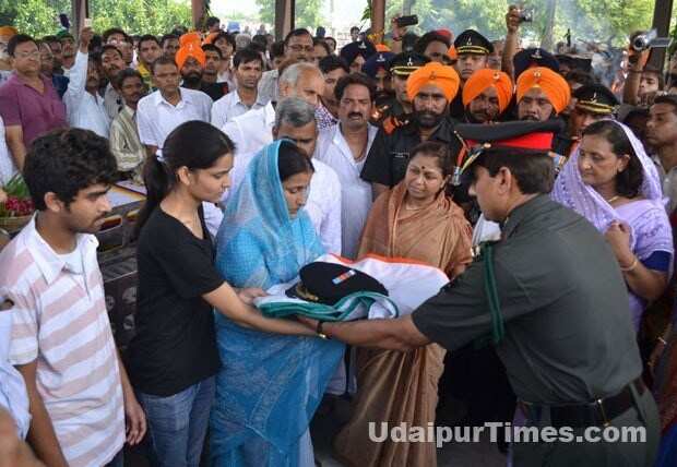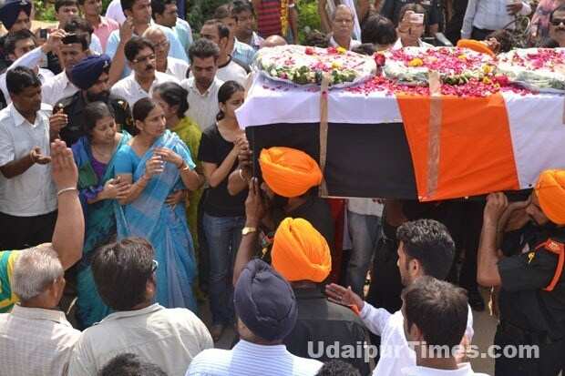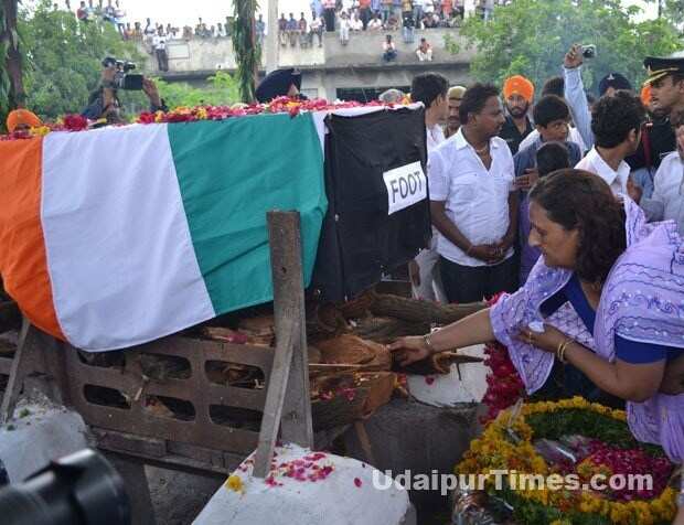 The 3 Sikh Light Regiment band played tunes of chivalry and heroism. As the procession started progressing towards the cremation ground, passing through the cardinal points of the city, it was joined in by masses which were eager to give their tributes to the lieutenant. The procession passing through city station-Surajpole-Townhall-Delhi gate-Court Chauraha-Chetak Circle-Ambamata , ended at the cremation ground at Rani Road at 10:30 AM , where the final rites of the lieutenant were performed with full state honor with army men fired shots in the air as a sign of gratitude to the martyr. To have a final glimpse of this hero from the city people didn’t refrained from climbing atop cliffs in the adjoining area and all this for nothing but to give their heart felt thanks to the lieutenant. When Divyanshi Verdia- Archit’s sister was enquired few days before, about her feelings, she replied quite confidently that she is proud of his brother. According to Divyanshi, Archit always used to say- “marte