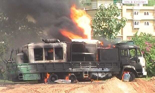 An area in the radius of 1 km was evacuated due to possibilities of blast in the compressor of the boring vehicle which was also filled with around 2500 liters of petrol. The laborers working on the site initially made attempts at their level to douse the fire before the fire brigade could arrive but in a while the vehicle got entangled in flames. There were no causalities reported in the incident but everybody at the scene was seen in a helter skelter. The fire was finally controlled at 3:30 in the evening.Resource: IN News Udaipur