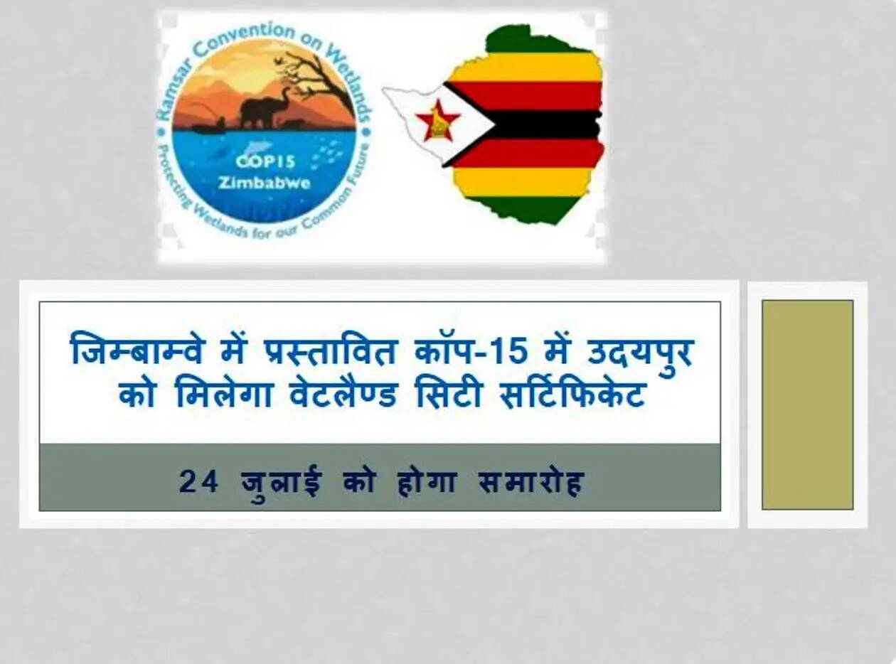उदयपुर 11 अप्रैल 2025 । रामसर कंर्वेशन ऑन वेटलैण्ड की ओर से आगामी 23 से 31 जुलाई 2025 तक जिम्बाम्वे में प्रस्तावित कॉप-15 कांफ्रेन्स में विश्व भर में नव घोषित 31 वेटलैण्ड सिटी को सर्टिफिकेट और अधिस्वीकरण पत्र प्रदान किए जाएंगे।