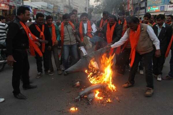 VHP members burnt the effigy of Owaisi and demanded strict action against the MIM leader. According to sources, Owaisi came into strong protest, after he had allegedly delivered hate speech in Adilabad, Andhra Pradesh that could spark communal tension.